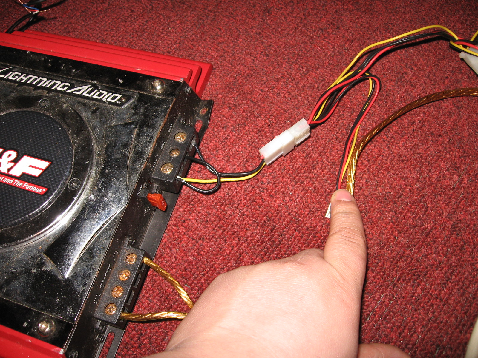 On our first test we just used in extra female Molex connector to connect the amp to the computer power supply. This Was proof of concept. The Amp was working and it actually sounded good, but we didn't want to put too much of a load on the power supply. For the amp to turn on it needs a + voltage to the Remote line. We connected the remote line to +12v.