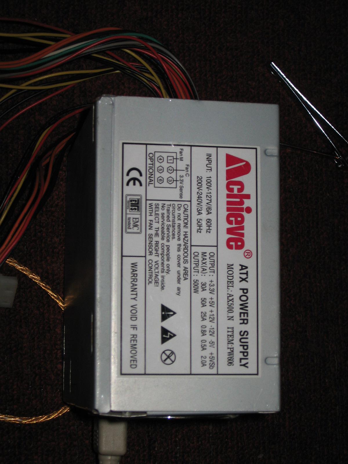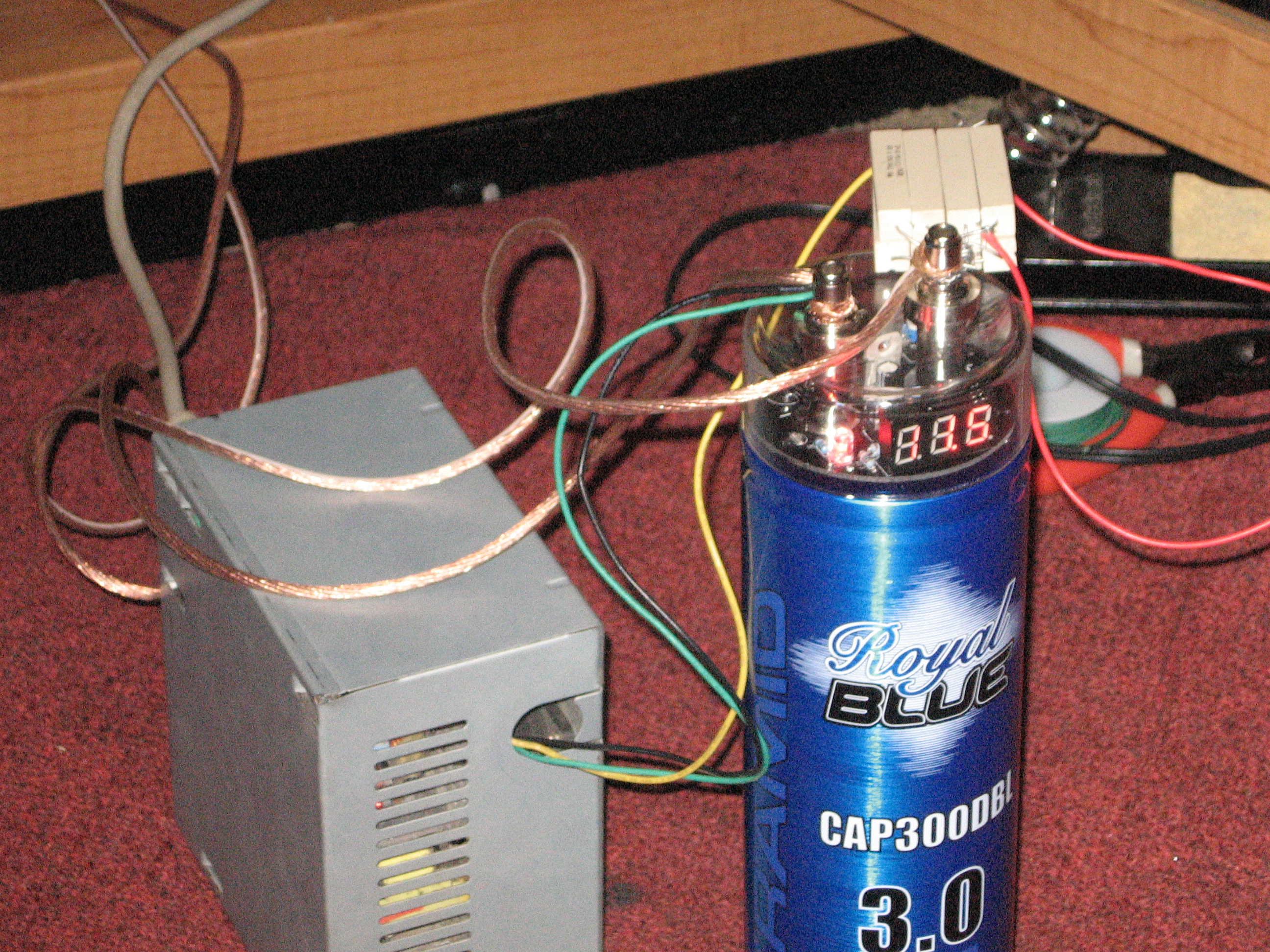 We had an extra 500w power supply laying around. This power supply is capable 25A on its +15v line. The power supply is a little on the low end side to power a car amp. In the car the amp would get ~14v and towards ~50A or more can be provided by the alternator. Because of this we decided we would at least need to get a capacitor to smooth out the voltage a little and help protect the power supply.