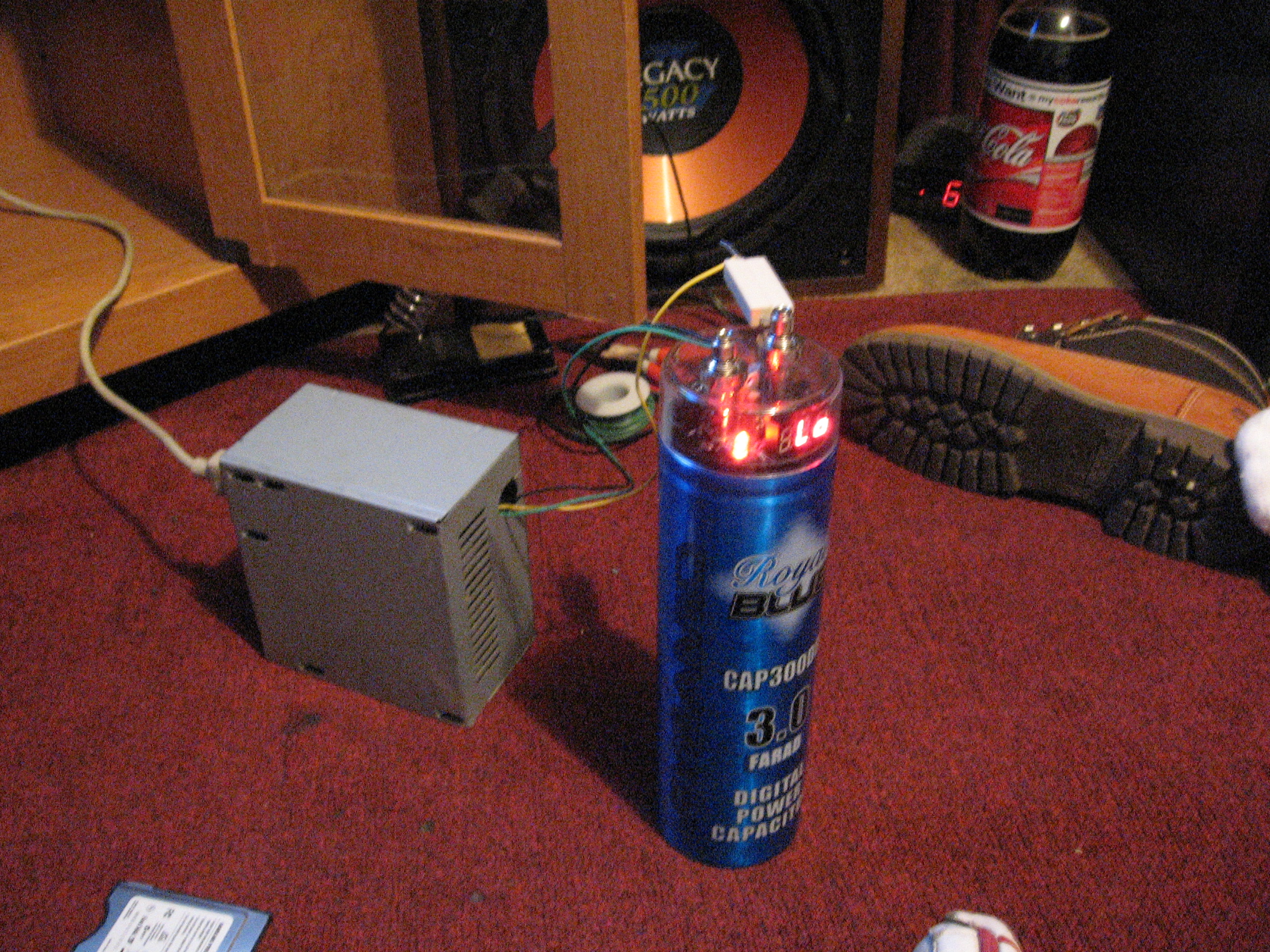 A few days later we got our capacitor. It is a 3.0F capacitor. We soon found out that until the capacitor is charged, it acts like a short. We had to get a resistor so that the power supply wouldn't shut off when hooked to the capacitor. RadioShack only had 100ohm 10w power resistors. We hooked 8 of them in parallel (to give us 12.5ohms). This allows the capacitor to charge without shutting off the power supply. It is still a little slow charging. I believe that is because when the capacitor is at a short, a 12.5ohm resistor only creates 0.96Amps. We ordered 3 1.5ohm 100W resistors for 0.5ohm in parallel, creating 24A , unfortunately the vendor could only supply one of them, meaning we will only have a current of 8A