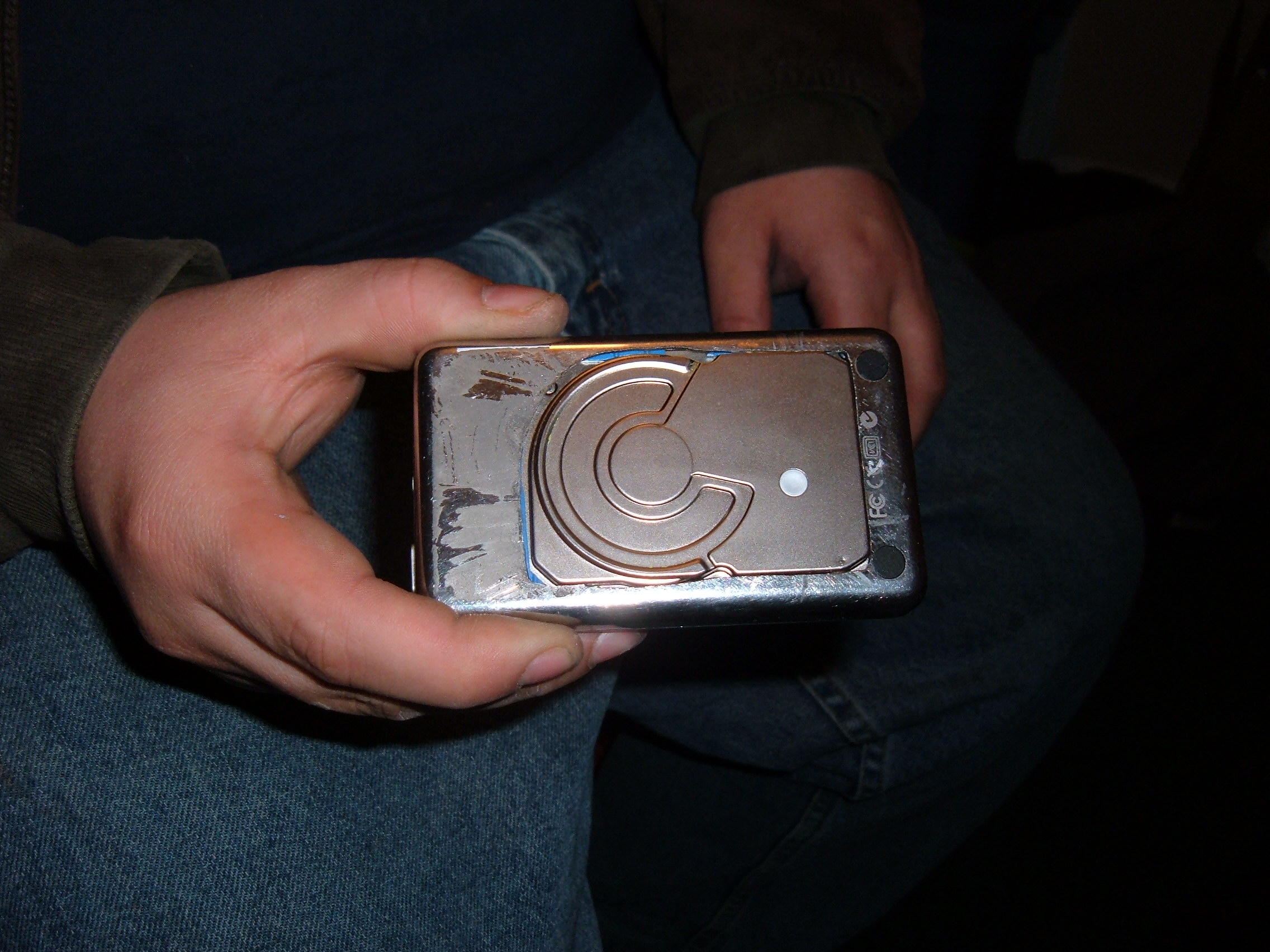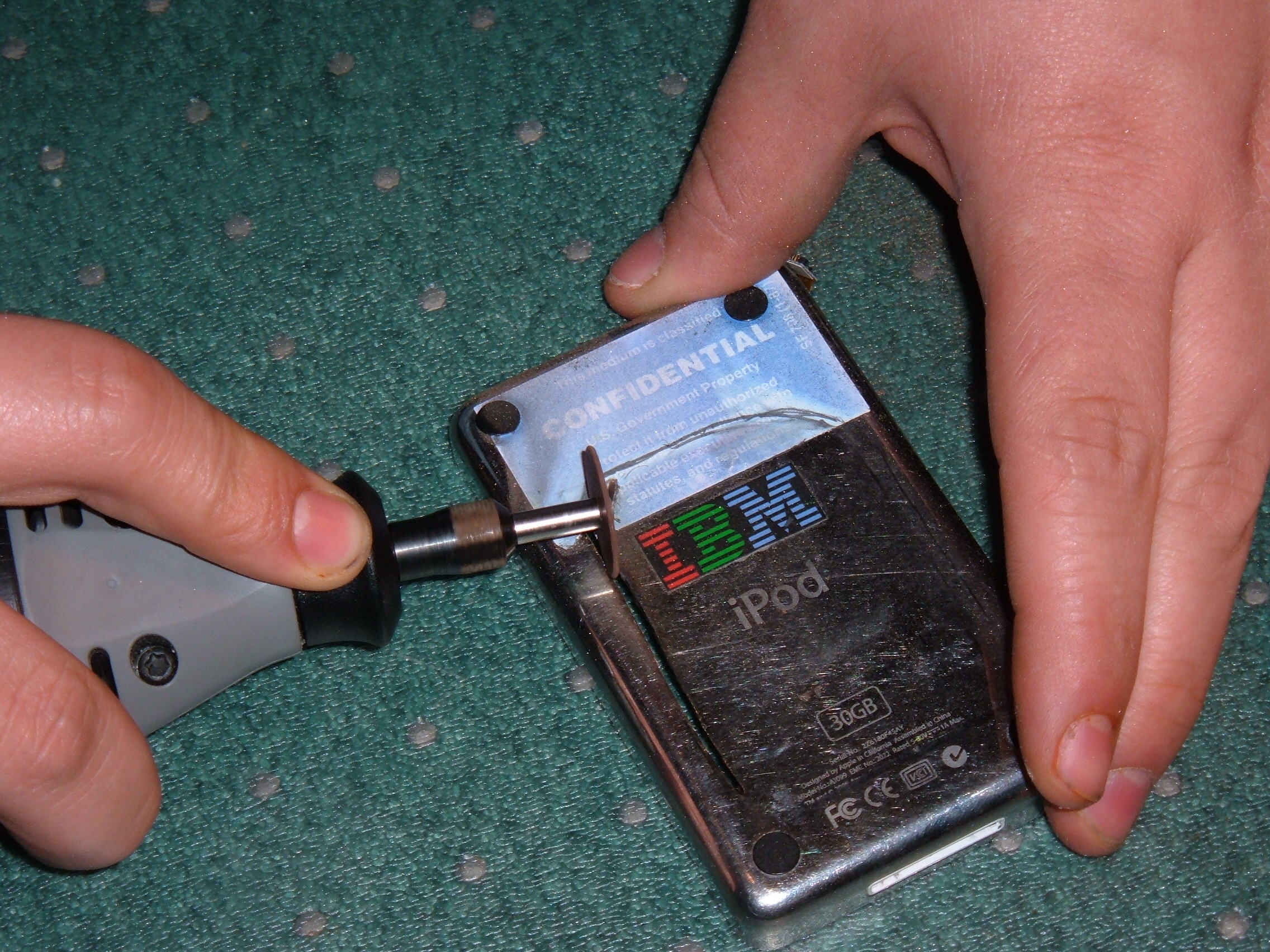 *Please Note* I do not recommend doing this to an iPod. We attempted this because we had the parts and we had a broken iPod. Modifying the iPod like this puts your hard drive at high risk.