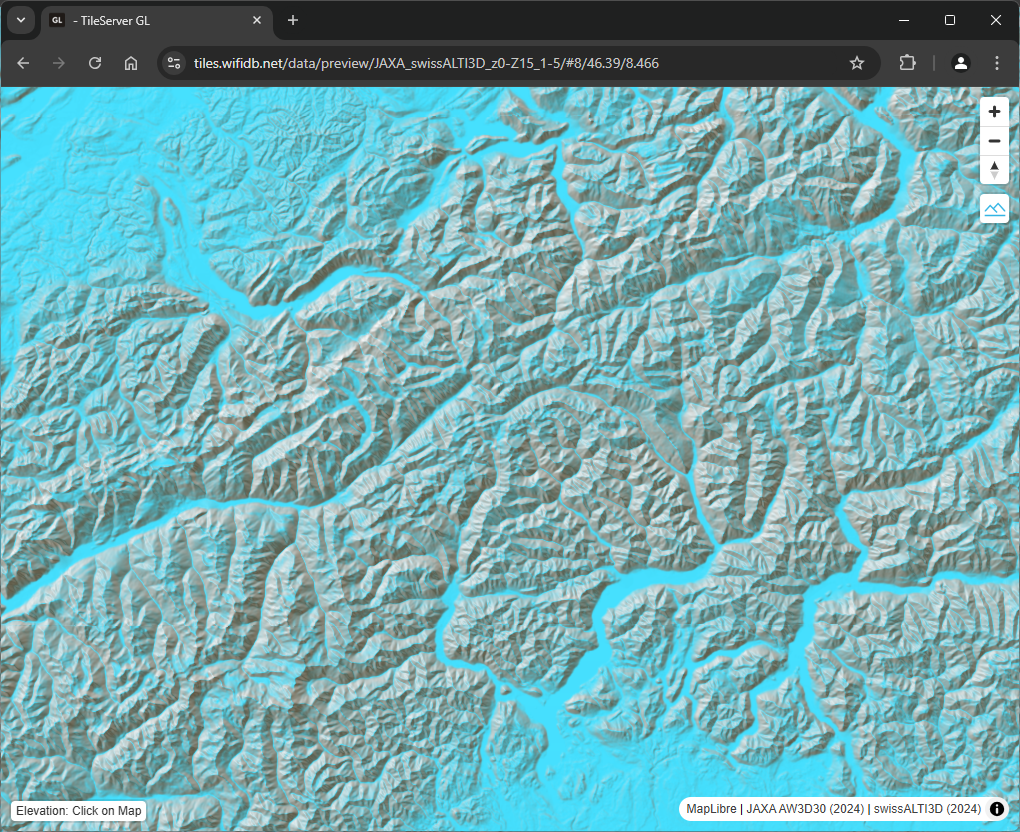 Description: Mapbox TerrainRGB z0-Z15 generated from the swissALTI3D 2024 raster-dem merged with the JAXA AW3D30 raster-dem.