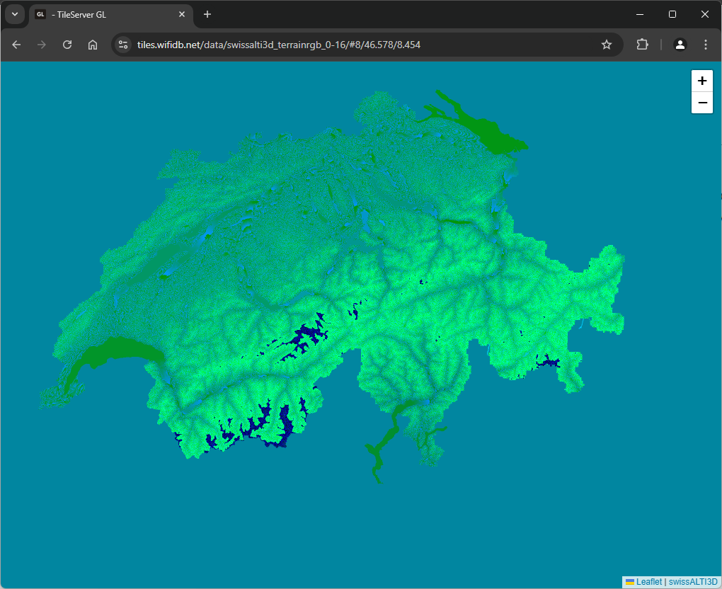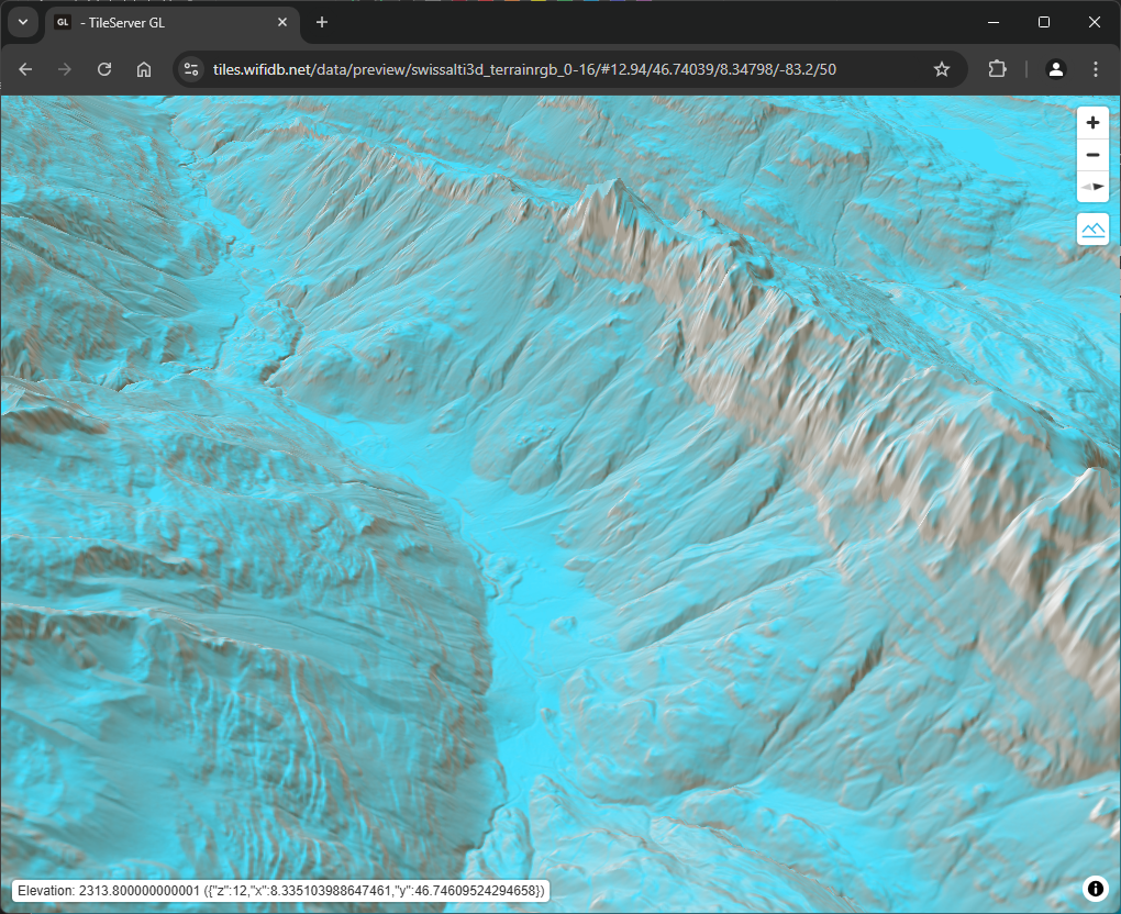Description: Mapbox TerrainRGB z0-Z16 generated from the swissALTI3D 2024 geotiff images.