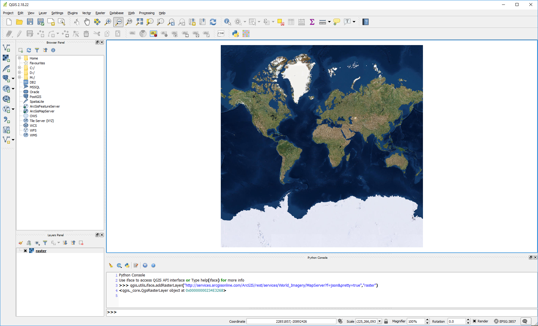4.) In the python console, load the World_Imagery raster map with "qgis.utils.iface.addRasterLayer("http://services.arcgisonline.com/ArcGIS/rest/services/World\_Imagery/MapServer?f=json&pretty=true","raster")" or the ESRI_Imagery_World_2D raster map with "qgis.utils.iface.addRasterLayer("http://server.arcgisonline.com/arcgis/rest/services/ESRI\_Imagery\_World\_2D/MapServer?f=json&pretty=true","raster")"