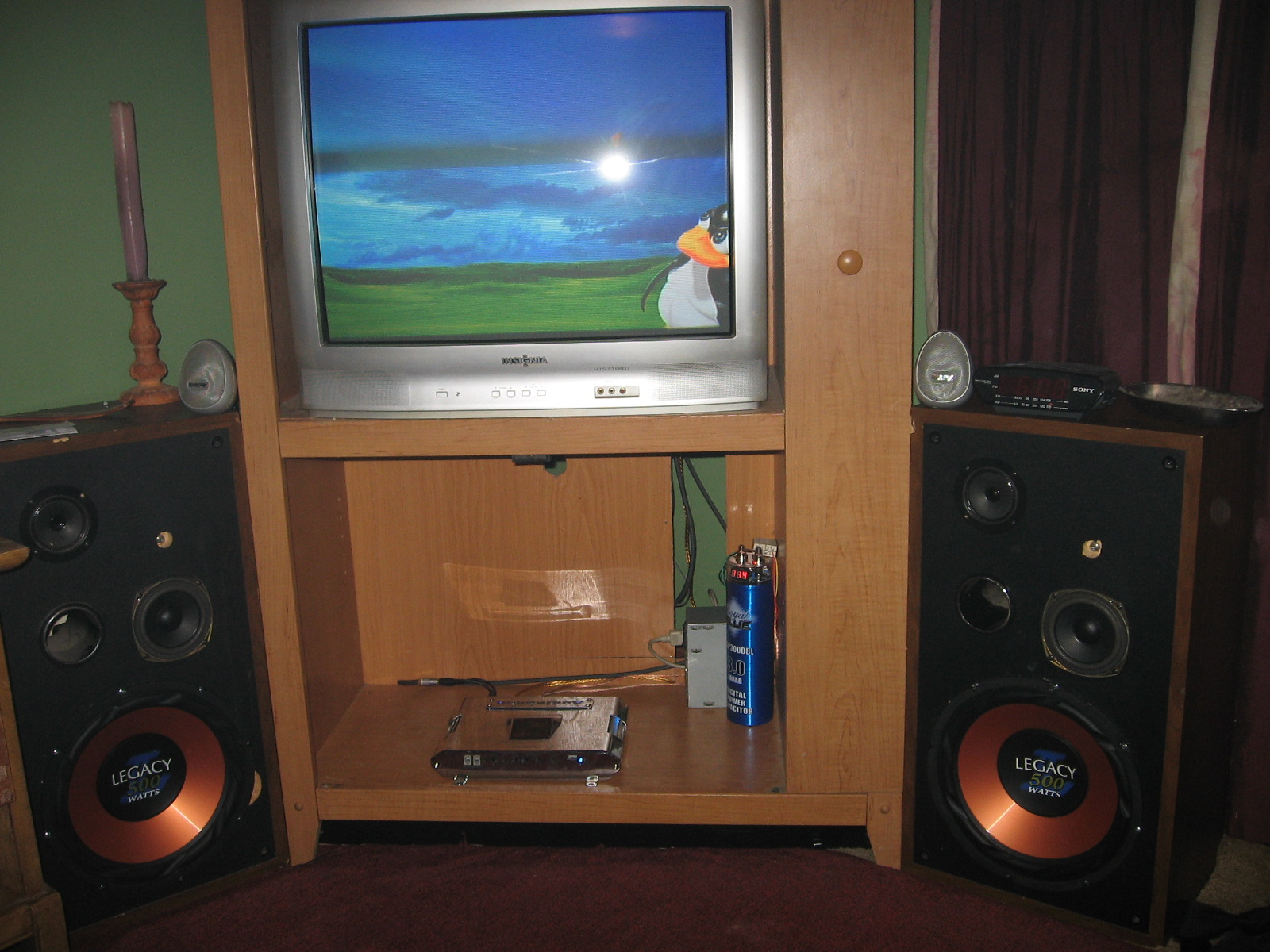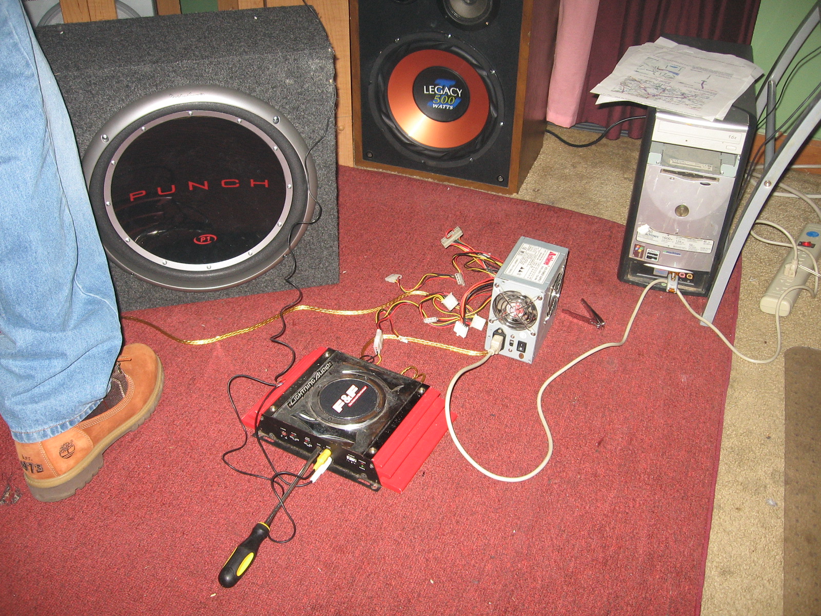 Recently a friend of mine wanted to use some car components in his home stereo. The Idea was to go from his home stereo subwoofer pre-amp out into the car amp, then to the 15 in sub. The problem was getting a power supply that could supply the power necessary for the amp (even when the amp was putting out a good amount of bass). After some researching I decided that the easiest option would be a computer power supply.