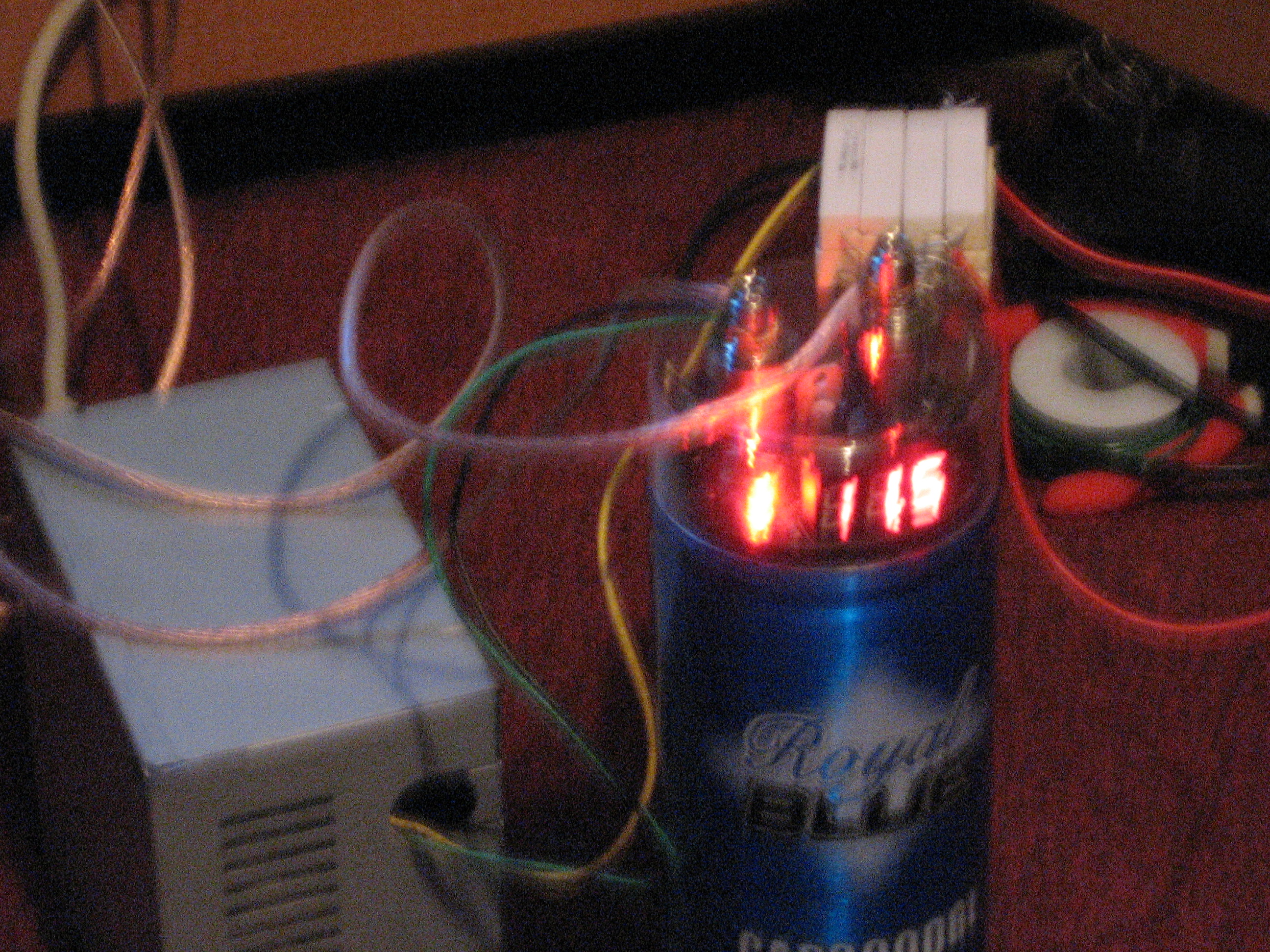 A few days later we got our capacitor. It is a 3.0F capacitor. We soon found out that until the capacitor is charged, it acts like a short. We had to get a resistor so that the power supply wouldn't shut off when hooked to the capacitor. RadioShack only had 100ohm 10w power resistors. We hooked 8 of them in parallel (to give us 12.5ohms). This allows the capacitor to charge without shutting off the power supply. It is still a little slow charging. I believe that is because when the capacitor is at a short, a 12.5ohm resistor only creates 0.96Amps. We ordered 3 1.5ohm 100W resistors for 0.5ohm in parallel, creating 24A , unfortunately the vendor could only supply one of them, meaning we will only have a current of 8A