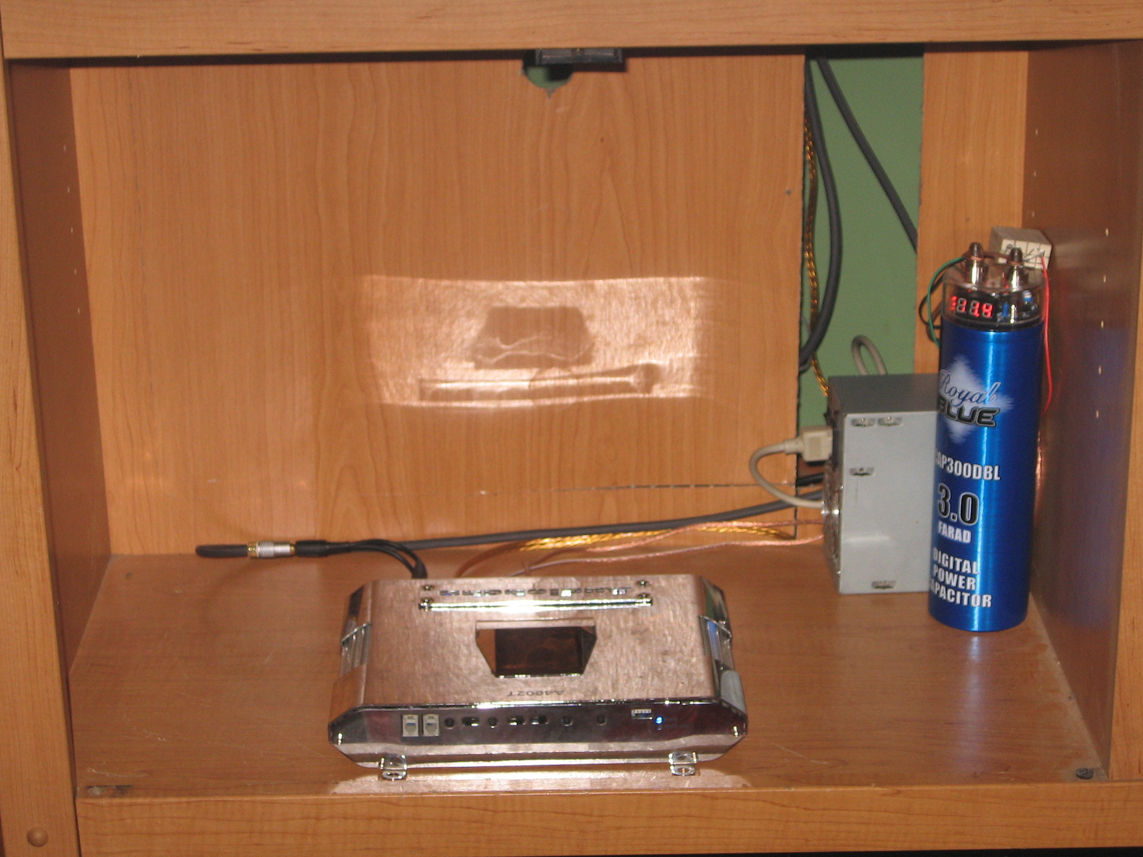 We had an extra 500w power supply laying around. This power supply is capable 25A on its +15v line. The power supply is a little on the low end side to power a car amp. In the car the amp would get ~14v and towards ~50A or more can be provided by the alternator. Because of this we decided we would at least need to get a capacitor to smooth out the voltage a little and help protect the power supply.