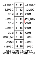 We started testing without the capacitor. To turn on the supply we connected pin 14(green) and 15(black) on the ATX connector
