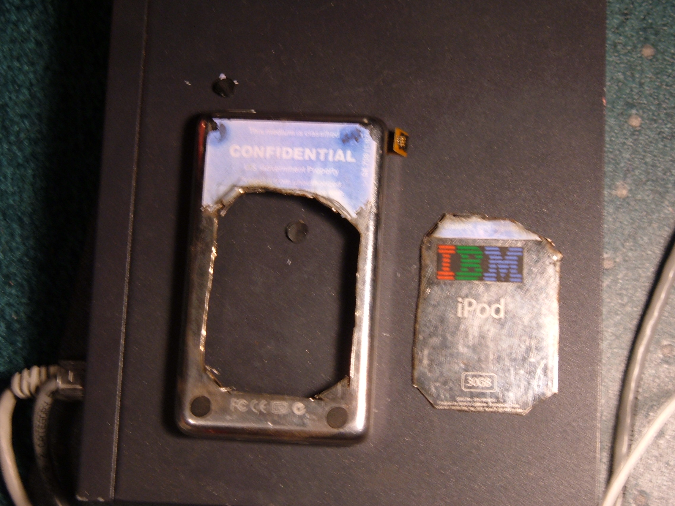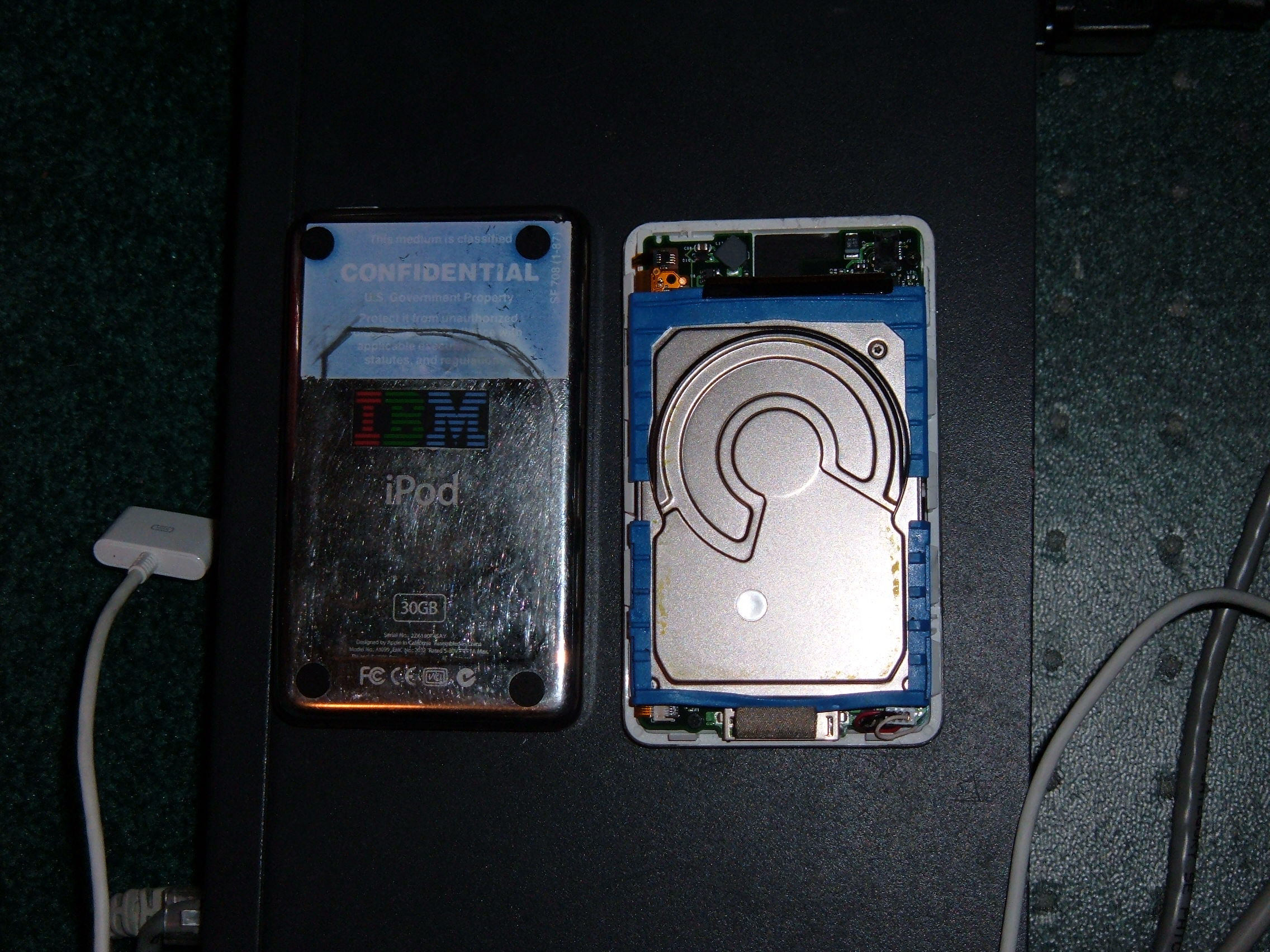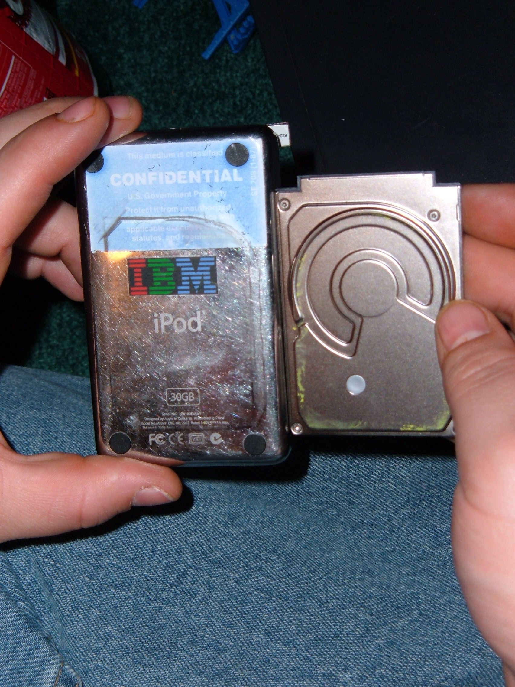 *Please Note* I do not recommend doing this to an iPod. We attempted this because we had the parts and we had a broken iPod. Modifying the iPod like this puts your hard drive at high risk.