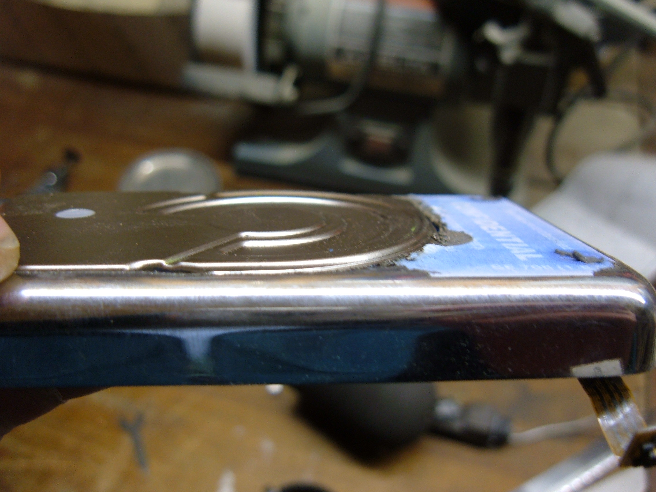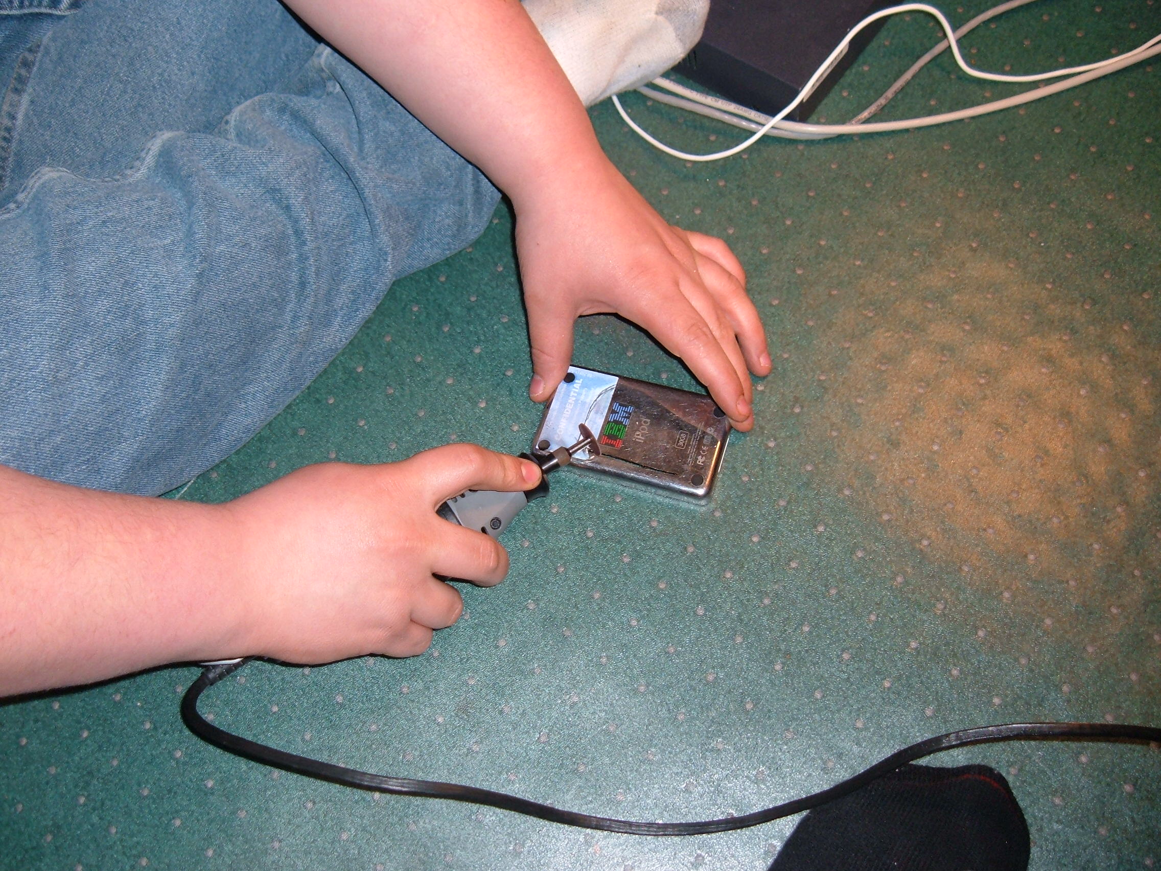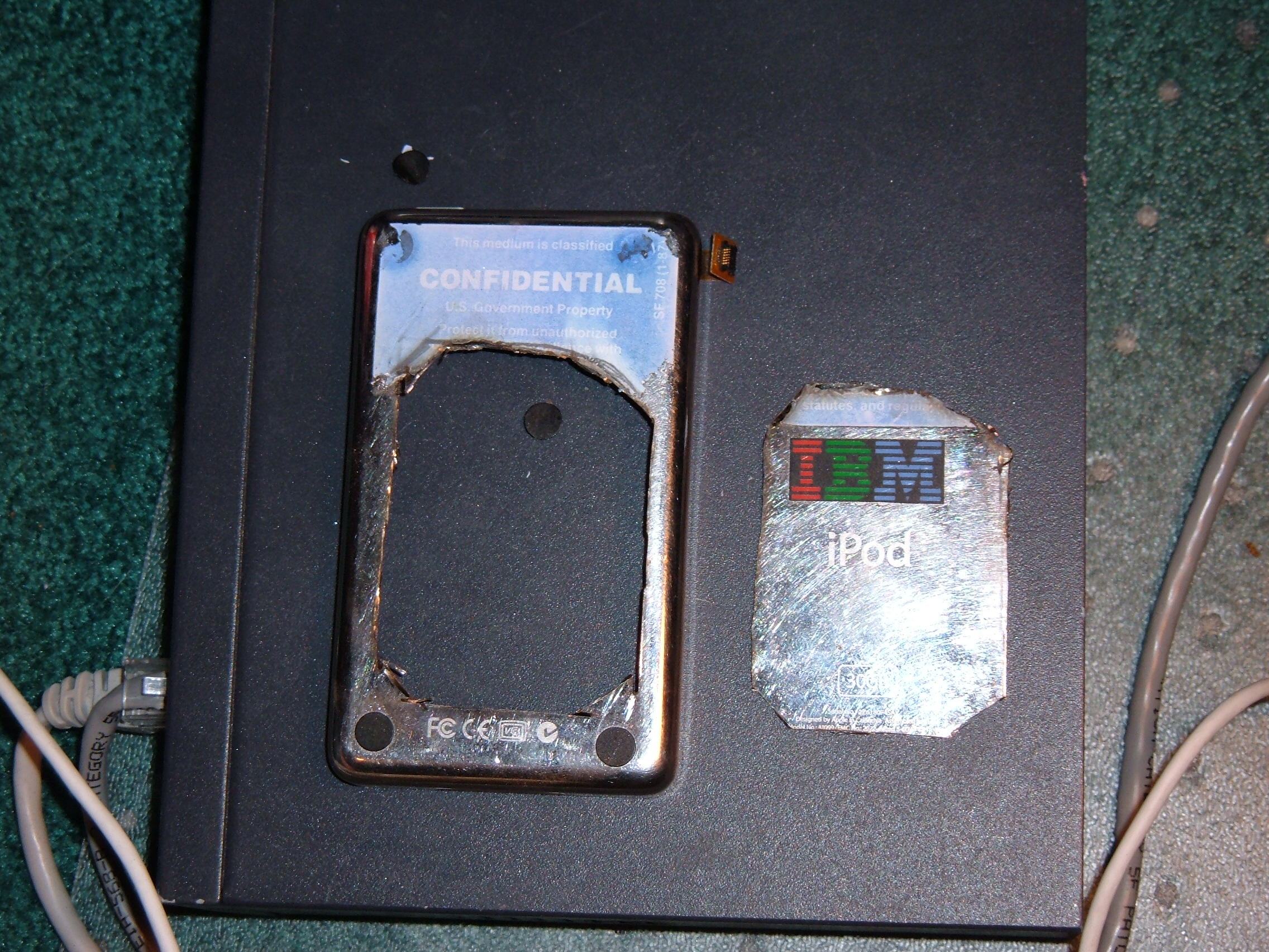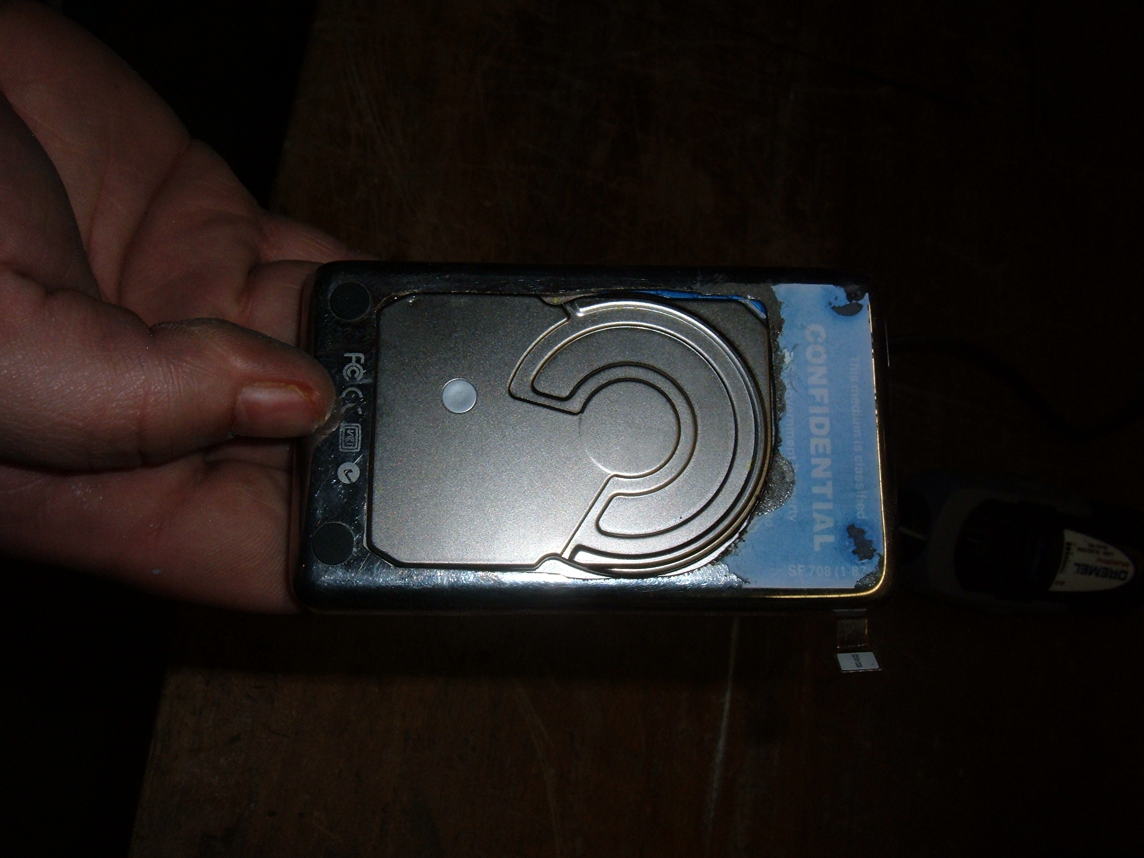 *Please Note* I do not recommend doing this to an iPod. We attempted this because we had the parts and we had a broken iPod. Modifying the iPod like this puts your hard drive at high risk.